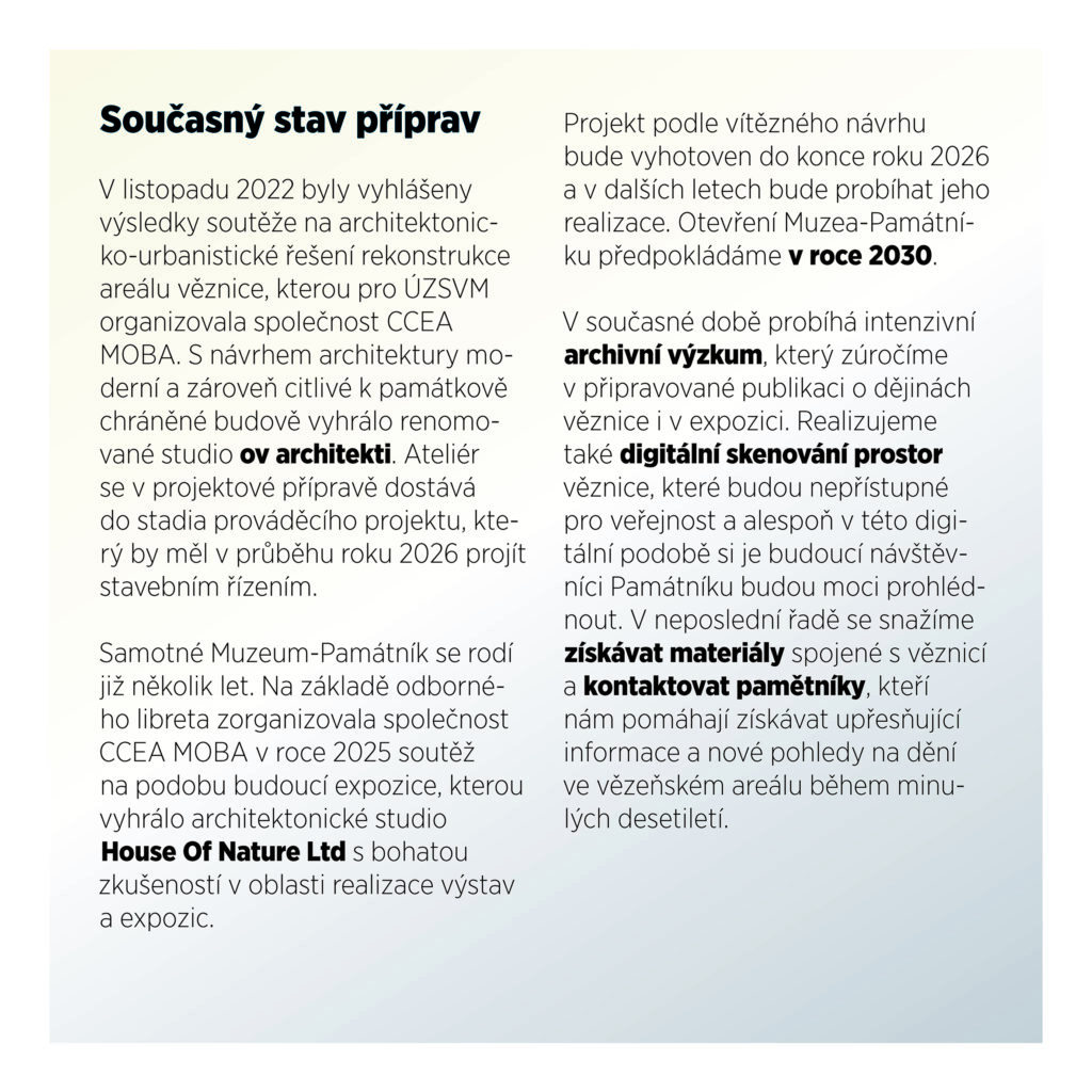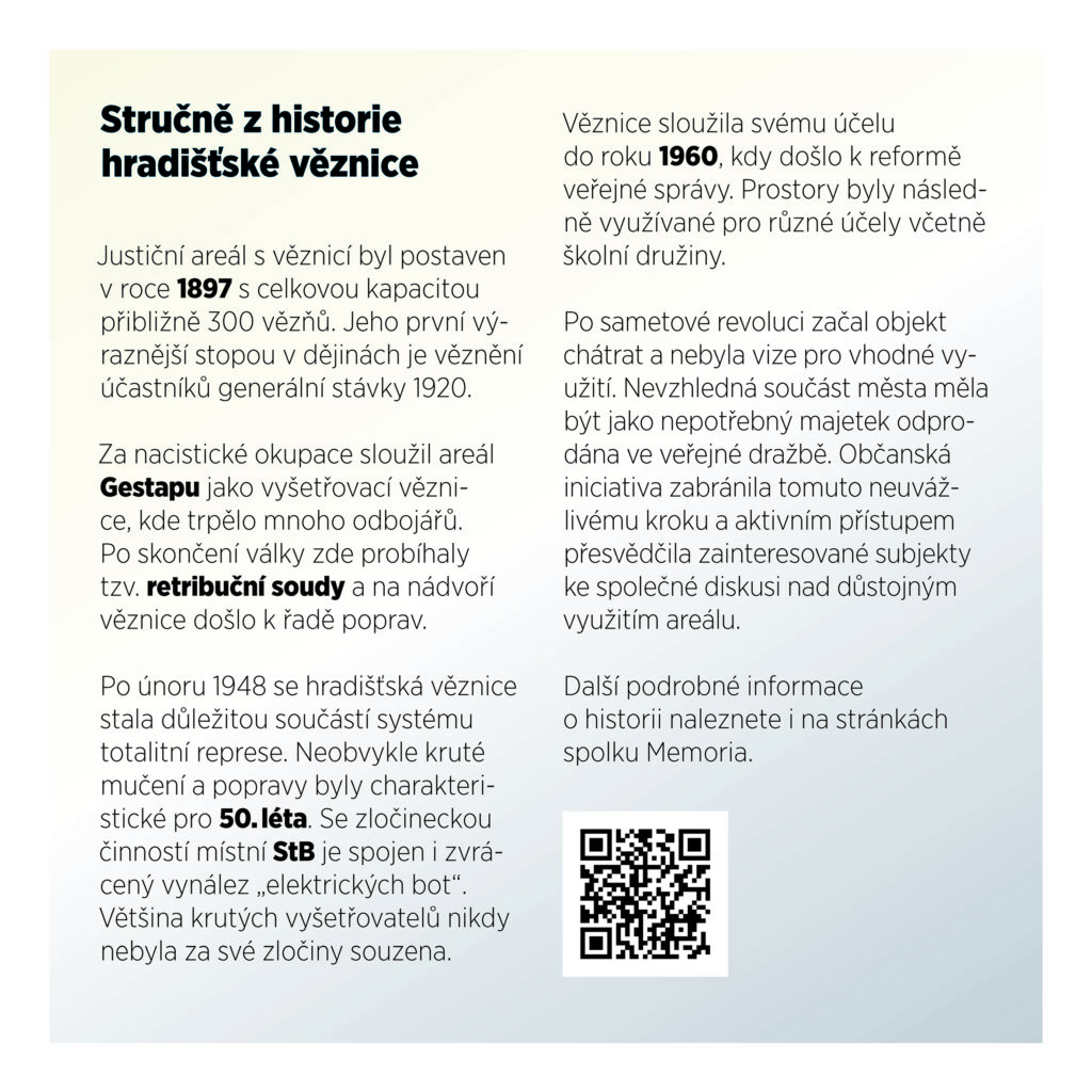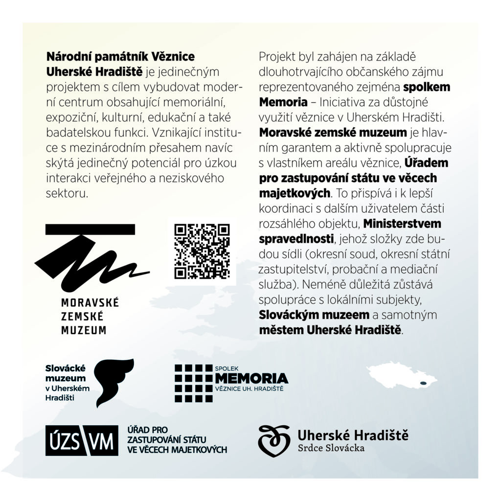 Představujeme novou informační brožuru, která shrnuje základní fakta, historické souvislosti i aktuální stav příprav Národního památníku Věznice Uherské Hradiště. Materiál vydalo Moravské zemské muzeum jako hlavní realizátor a garant vzniku i budoucího provozu muzea-památníku, a to ve spolupráci s partnery, kteří se dlouhodobě podílejí na záchraně a důstojném využití areálu – včetně spolku Memoria.